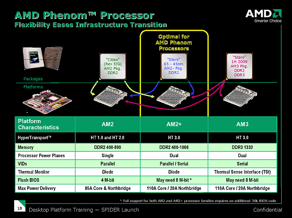 Платформа Socket AM2+, как нетрудно догадаться, является оптимальной для процессоров Phenom с поддержкой DDR2, и до перехода на DDR3 будет выпущено 45 нм семейство, также в расчете на данный разъем. Широкую совместимость между процессорами и платами для разных платформ планируется обеспечить в обещанных рамках.