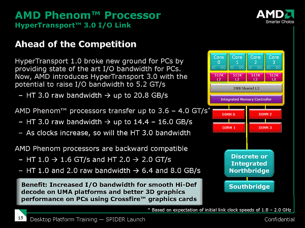 Шина Hyper-Transport версии 3.0 имеет удвоенную пропускную способность, однако, разные версии процессоров Phenom будут рассчитаны на промежуточные частоты этой шины. Впрочем, пропускная способность этой серверной шины для настольных ПК, даже максимально укомплектованных видеокартами, работающими в режиме CrossFire, выглядит избыточной даже на этих промежуточных частотах. Полная совместимость с Hyper-Transport 1.0 и 2.0 обеспечивается, поэтому новые процессоры можно установить на платы с поддержкой предыдущих версий Hyper-Transport.