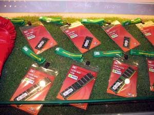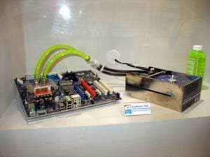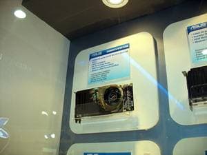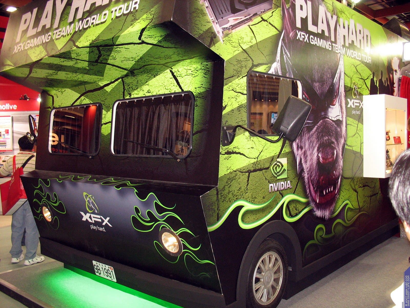 Стенд компании XFX представлял собой некую бронированную машину, окращенную в защитный цвет (тот же цвет — любимый у NVIDIA, что опять неудивительно, если учесть, что XFX выпускает карты на базе процессоров только от калифорнийской компании). Удивительно можно было увидеть на стенде XFX не только видеокарты, но и системные платы. Впрочем, XFX самостоятельно их не выпускает, а закупает по каналам OEM.