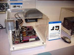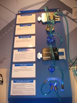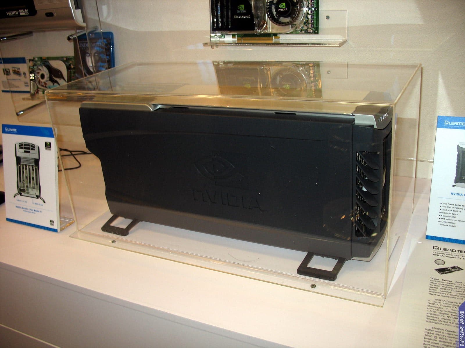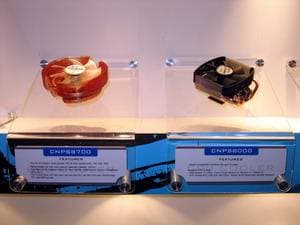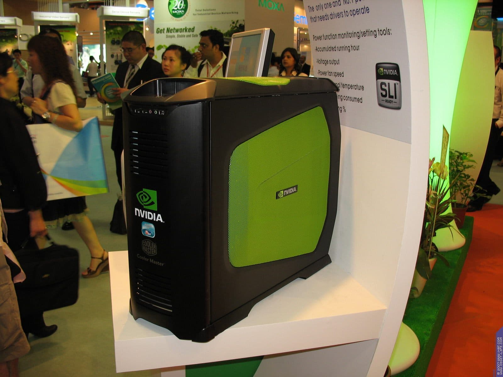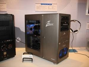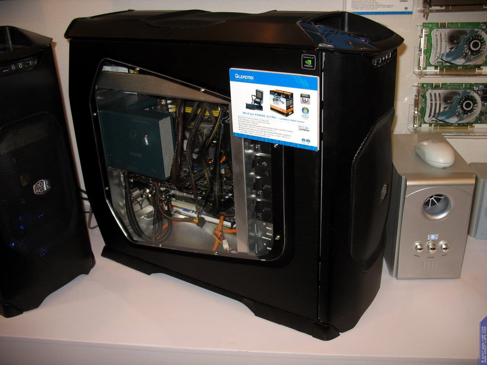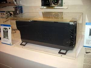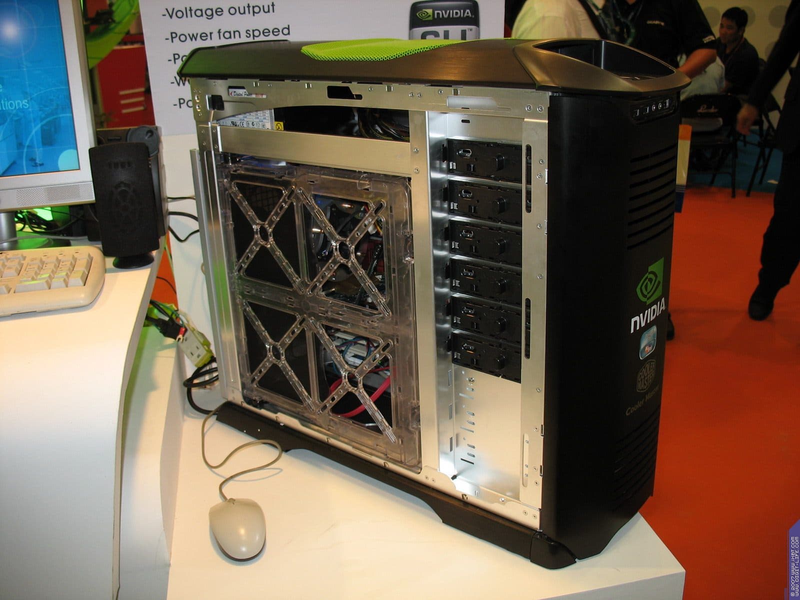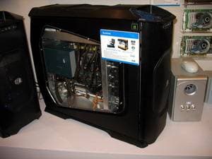 В предыдущем репортаже мы говорили про компанию Coolermaster, однако наиболее интересным экспонатом можно назвать концепцию для NVIDIA, которая подразумевает установку внутри системника до 4-х видеокарт в режиме SLI. При этом размеры корпуса увеличиваются лишь в глубину (чтобы полноценно охлаждать отдельный блок с HDD), когда как высота и ширина - в рамках привычного.