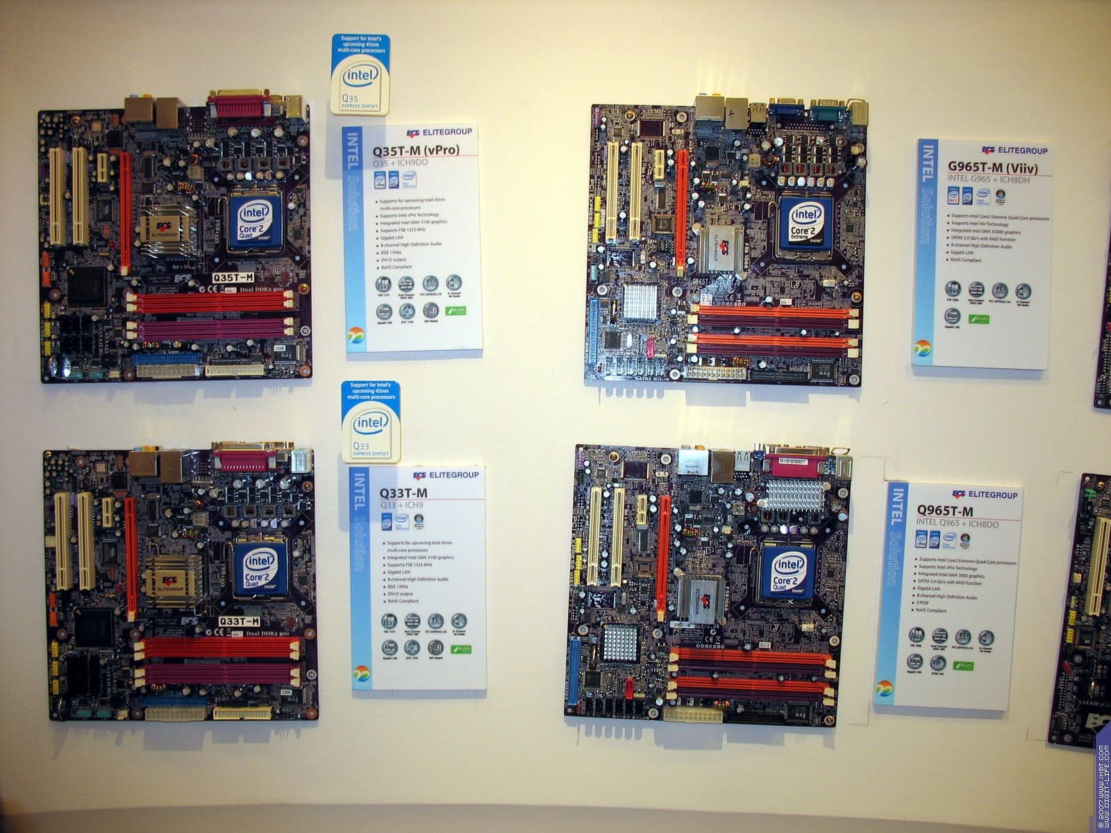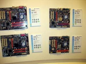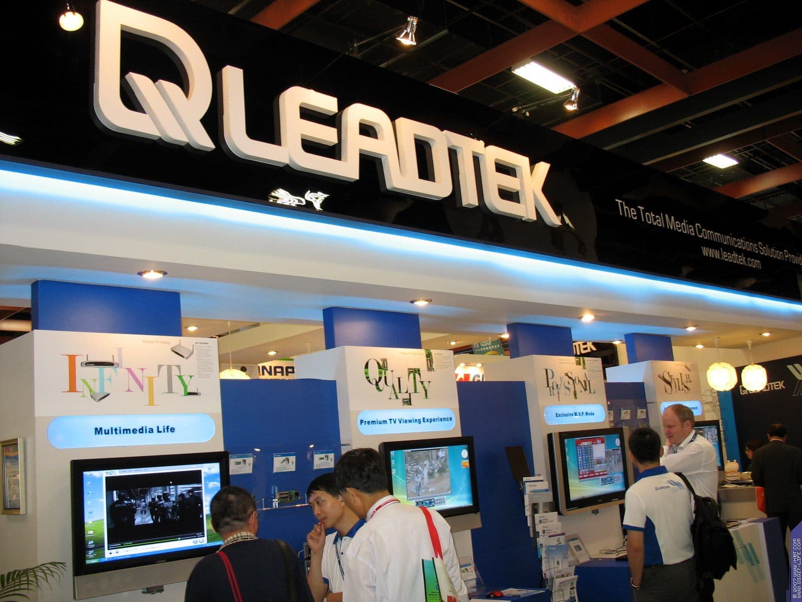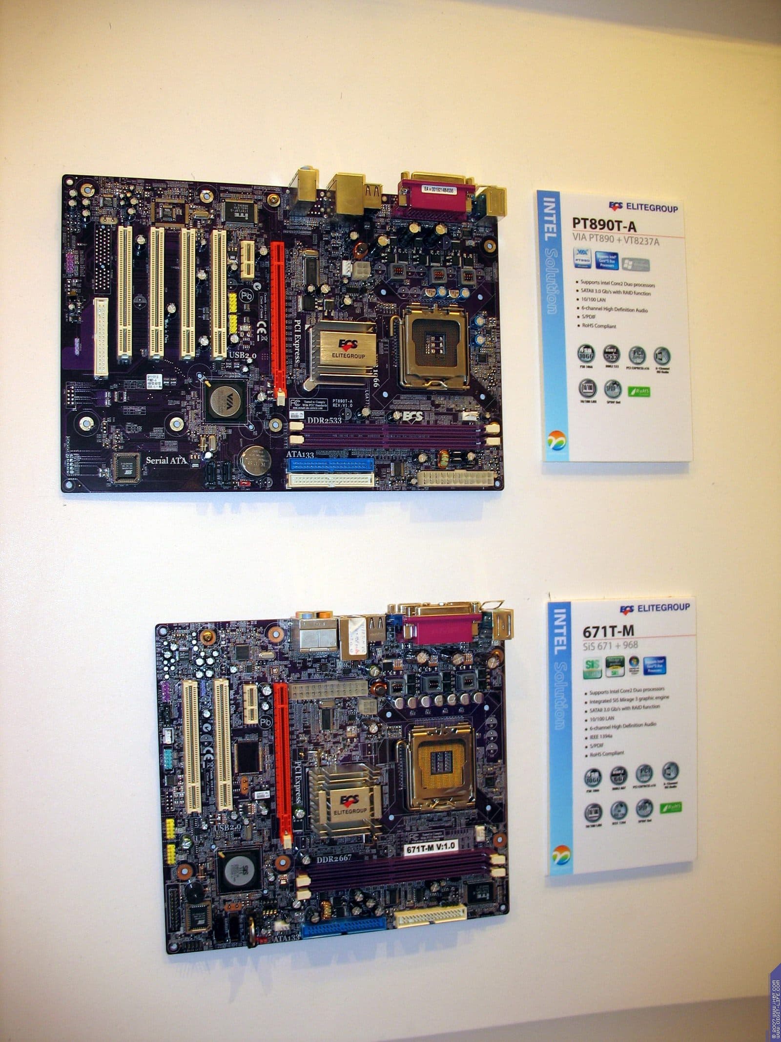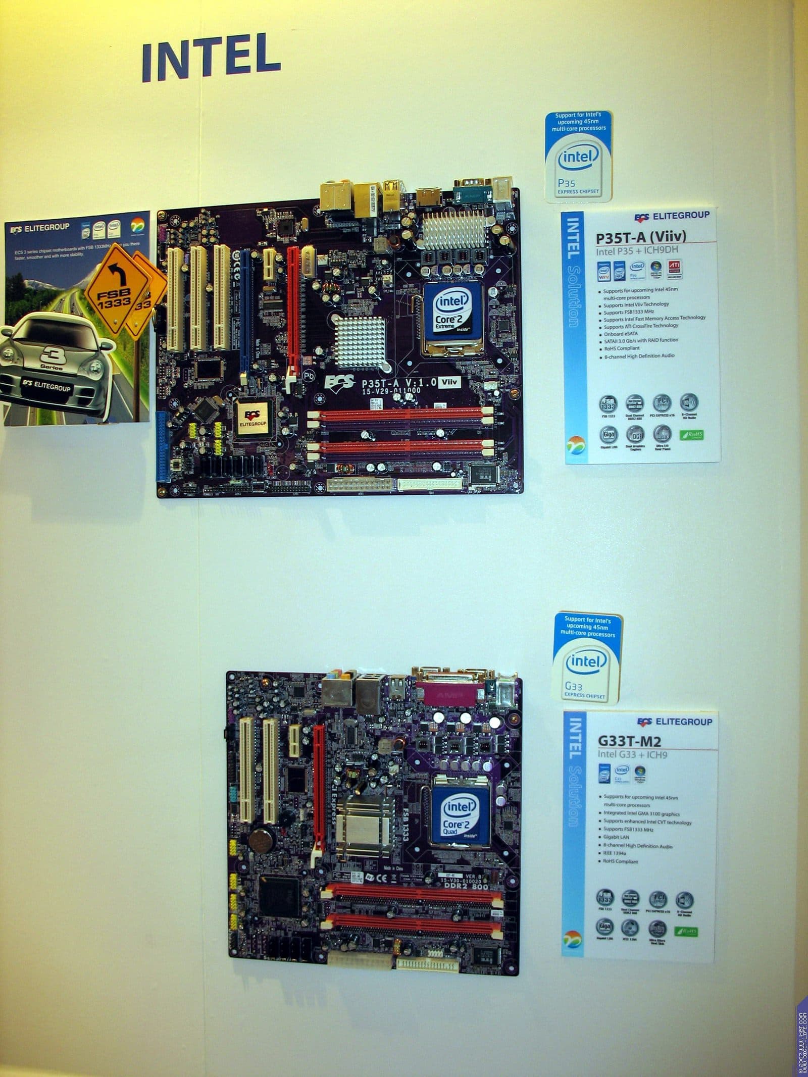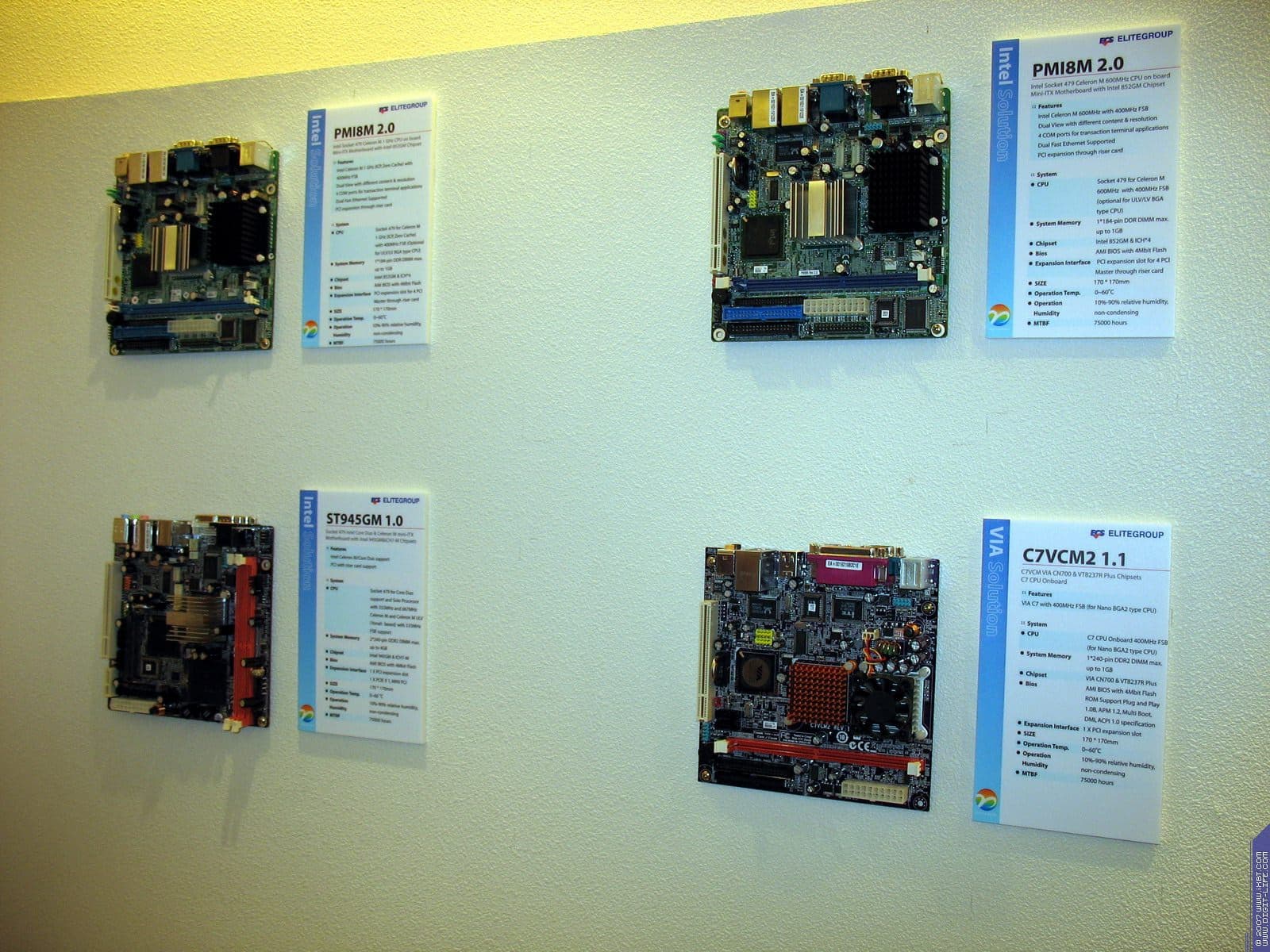 В том же павильоне, но двумя этажами выше, располагался гигантский павильон компании ECS/Elitegroup, которой в этом году исполнилось 20 лет. Безусловно, самый богатый и просто колоссальный ассортимент у фирмы — среди системных плат. Просто глаза разбегаются от обилия видов, типов, марок. По словам представителей компании нет ни одного чипсета, ни одной шины, ни одного форм-фактора, который бы не поддерживался бы ECS в их материнских платах. Причем, от самых дешевых и бюджетных, вплоть до очень дорогих с шикарным комплектом.