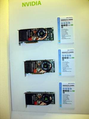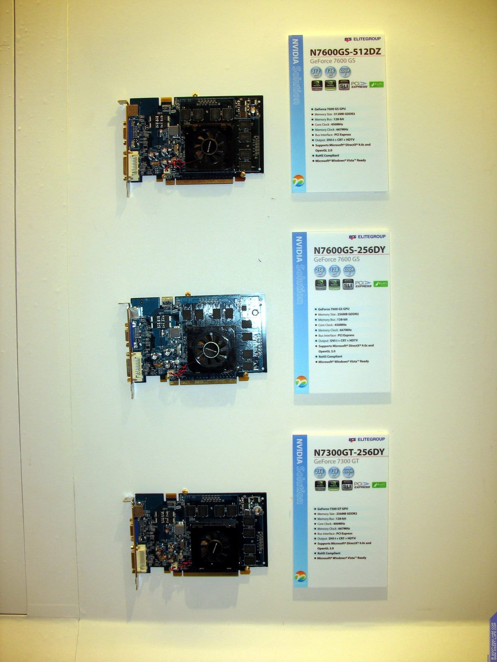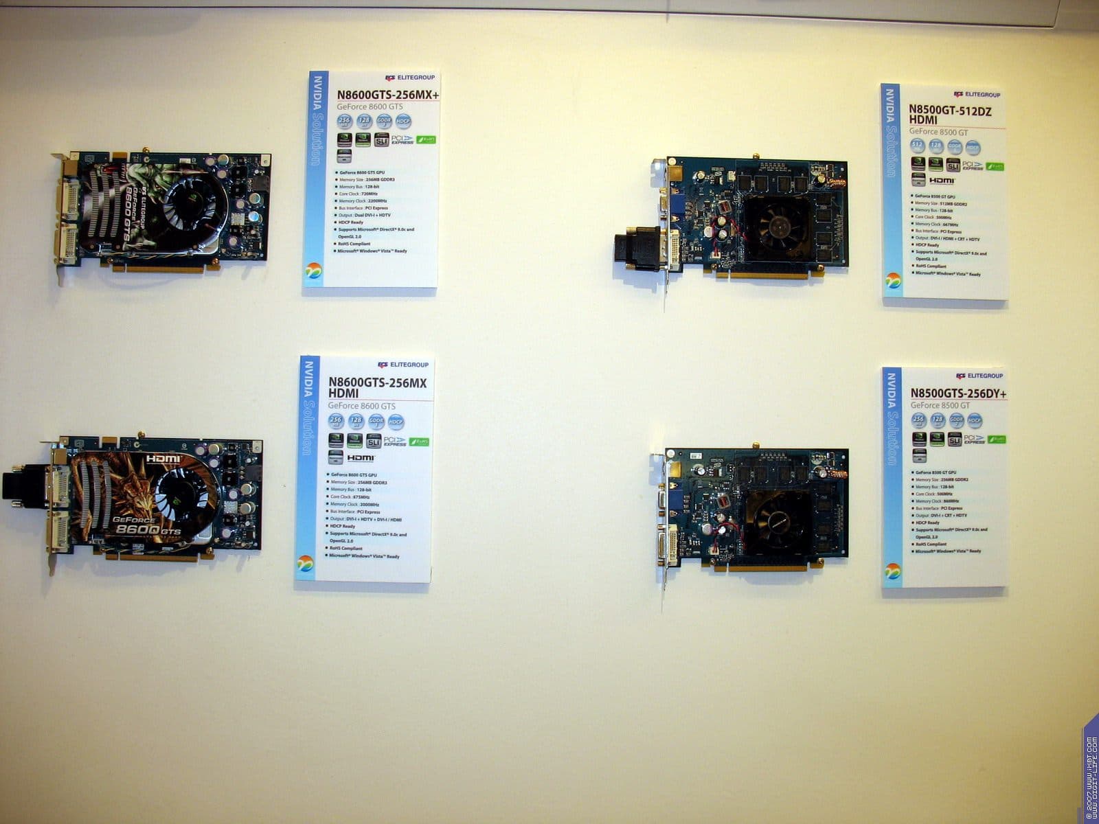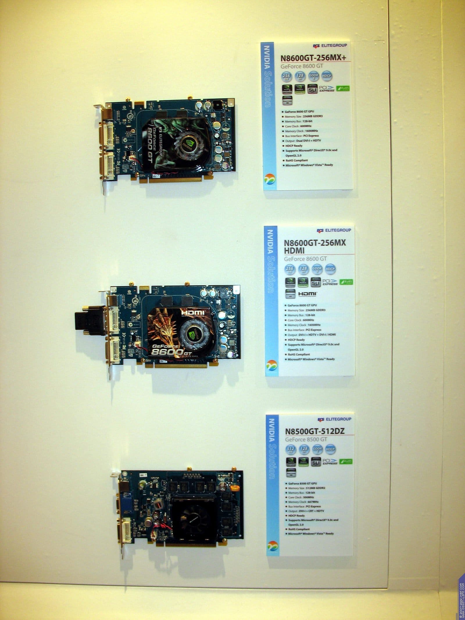 Год назад компания возобновила бизнес по выпуску видеокарт, пока они производятся на базе процессоров от NVIDIA. Представлены также практически все виды современных видеокарт на всех чипах калифорнийского производителя. Напоминаем еще раз, что Hi-End карты выпускает NVIDIA самостоятельно, и ECS, как и иные партнеры NVIDIA, покупают у последней уже готовые платы.