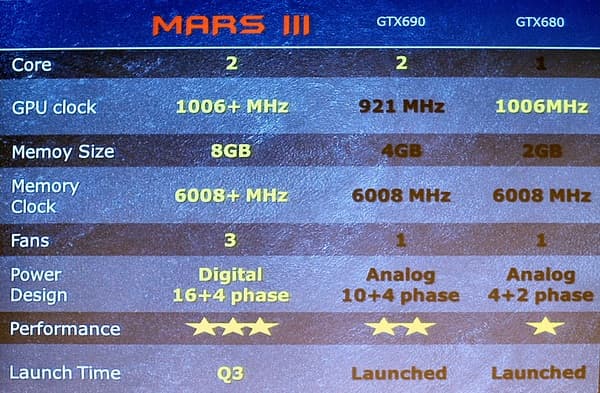 На следующей презентации речь шла о новых видеокартах и уникальных технических решениях, реализованных в них. Первая модель, о которой пошла речь — Mars III. Ее основным отличительным признаком стало то, что новая видеокарта имеет «бескомпромиссно» (это слово в последнее время почему-то полюбили все производители, характеризуя свои продукты) высокие частоты работы.