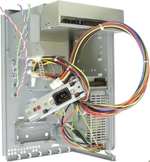 Провода, идущие от разъема питания и переключателя напряжения к блоку питания, натянулись. Для продолжения процесса необходимо вытащить планку, на которой крепится разъем питания и переключатель, и больше ничто не помешает добраться до внутренностей PC.