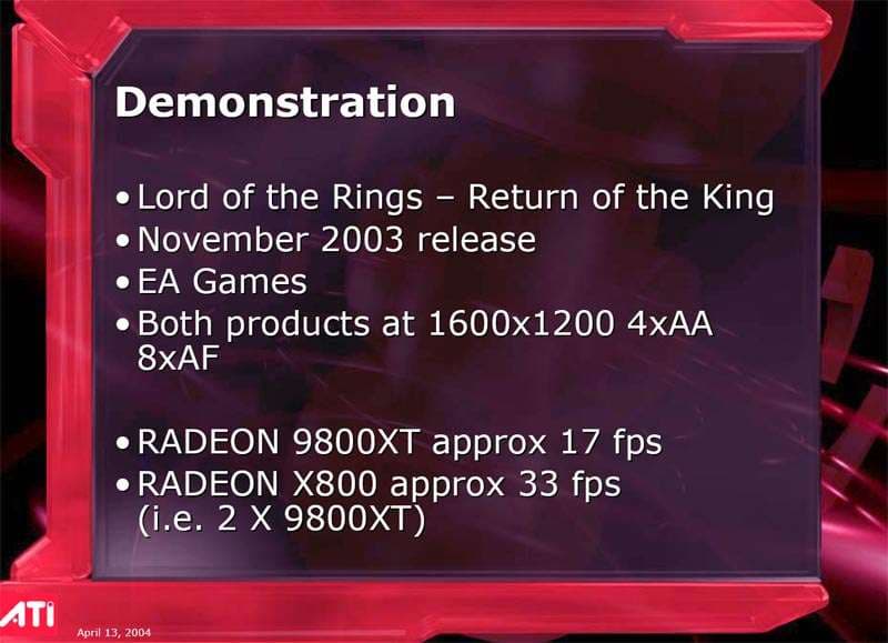 Его выступление затрагивало в целом ситуацию в ATI на сегодня, он рассказал о некоторых планах, ну и были продемонстрированы общие показатели по R420. Как можно видеть ниже, руководство компании не испытывает страха перед новинкой от конкурентов (NVIDIA), показывая на диаграммах весьма высокие скоростные параметры R420. Разумеется, о том, что у NVIDIA NV40 есть шейдеры 3.0, а у продукта из Канады их нет, предпочитают молчать, лишь при задавании вопросов на эту тему, идет ответ о том, что эта технология пока не нужна, и не зачем тратить на нее транзисторы в кристалле и людские ресурсы. Подробно об этом можно узнать, прочитав наше интервью с ведущими сотрудниками ATI.