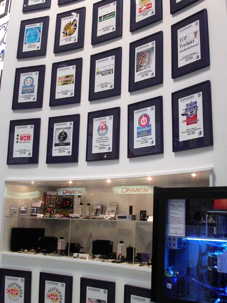 Давний же прантер NVIDIA — компания Gainward ничем на своем стенде не удивлял, но встречал посетителей целой стеной наград, на которой можно было найти и награду от iXBT.com.