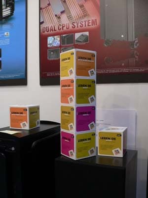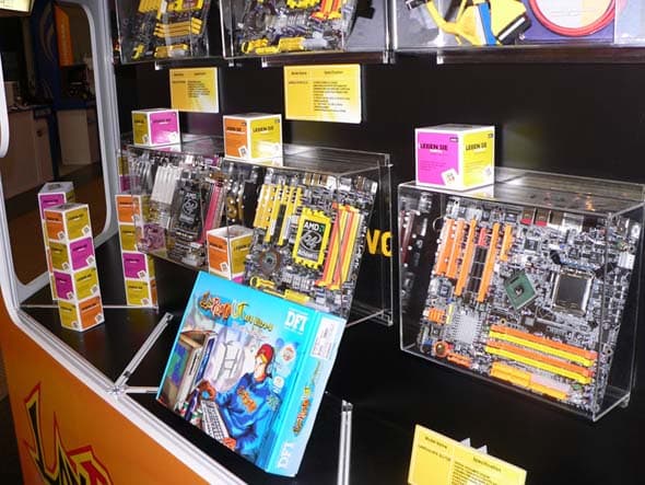 Не обошлось и без курьезов, представители компании DFI, очевидно, успели одними из первых на раздачу рекламных материалов и запаслись ими в избытке. Так что кубиков хватило даже для оформления материнских плат на чипсетах под процессоры конкурента (крайняя справа):