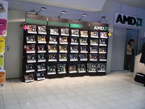 Хотя AMD на этот раз и не имела собственного стенда, неискушенному посетителю вполне могло показаться, что 22 и 23-ий павильоны, где обычно концентрируются производители системных компонентов, в некотором роде и есть «распределенные» стенды данной калифорнийской компании. Дело в том, что AMD разместила свои демо-системы и символику на стендах 64 компаний-партнеров — производителей материнских плат, видеокарт, кулеров, сборщиков готовых систем, ТВ-тюнеров, периферии и даже разработчиков ПО.