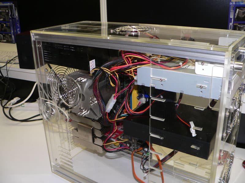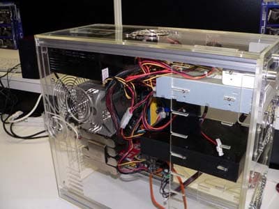 Вообще, оригинальным способам охлаждения SLI, как и самим демо-системам со сдвоенными видеокартами было отведено почетное место на выставке, причем разработчики явно стремились доказать, что «SLI — это не так страшно». Для доказательства чего, SLI-платформы помещались в компактные корпуса, в том числе формата barebone (Shuttle), платы на nForce4 SLI были представлены и в mATX-формате (ABIT), а для наглядной демонстрации экономичности Athlon 64 4000+ с парой видеокарт на GeForce 6800GT использовался блок питания мощностью 350 Вт: