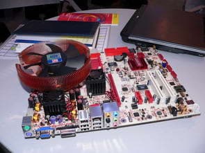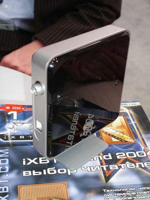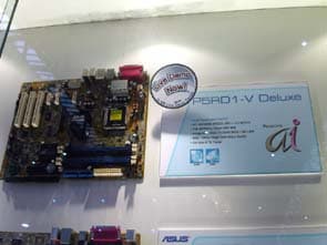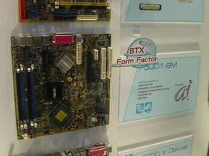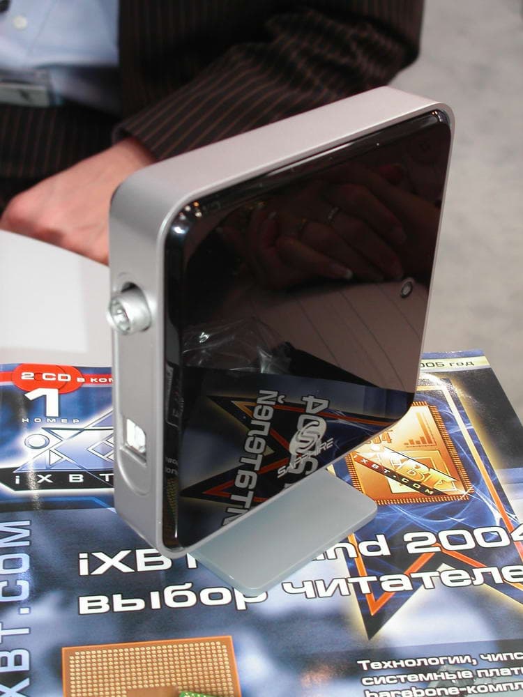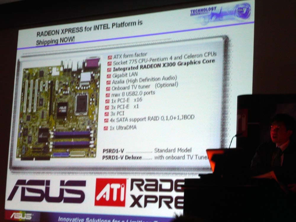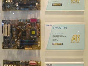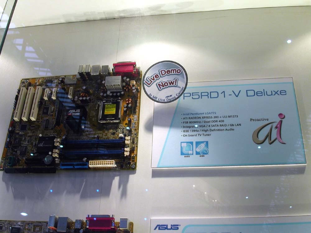 Значительное внимание было уделено плате ASUS на чипсете ATI Xpress 200 + ULI M1573 для процессоров Intel LGA775, вариация которой также демонстрировалась в рабочем режиме с подключенным встроенным ТВ-тюнером.