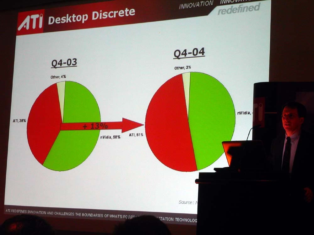 Если говорить о главном партнере Sapphire — компании ATI, то канадцы явно стремились показать на CeBIT, что у них дела идут очень даже неплохо. На пресс-конференции демонстрировались слайды, где сотрудники ATI с гордостью рапортовали об увеличении продаж на рынке дискретной графики для настольных ПК до 51%.