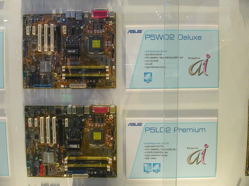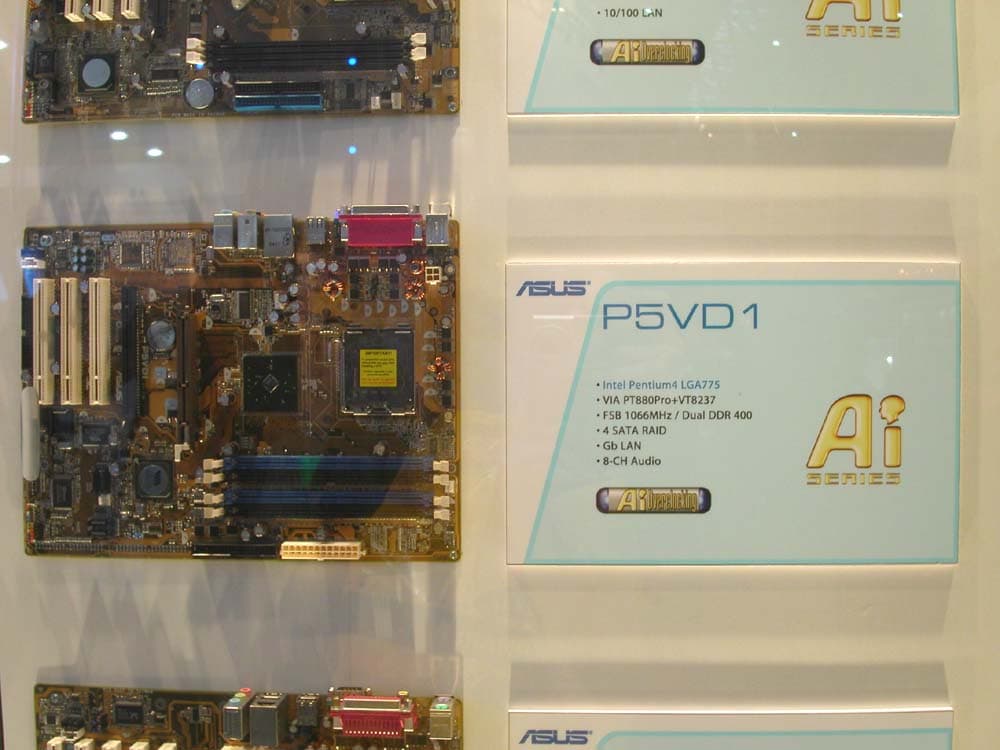 На стенде можно было найти великое множество системных плат. Например, на базе i945/i955, VIA PT880Pro