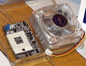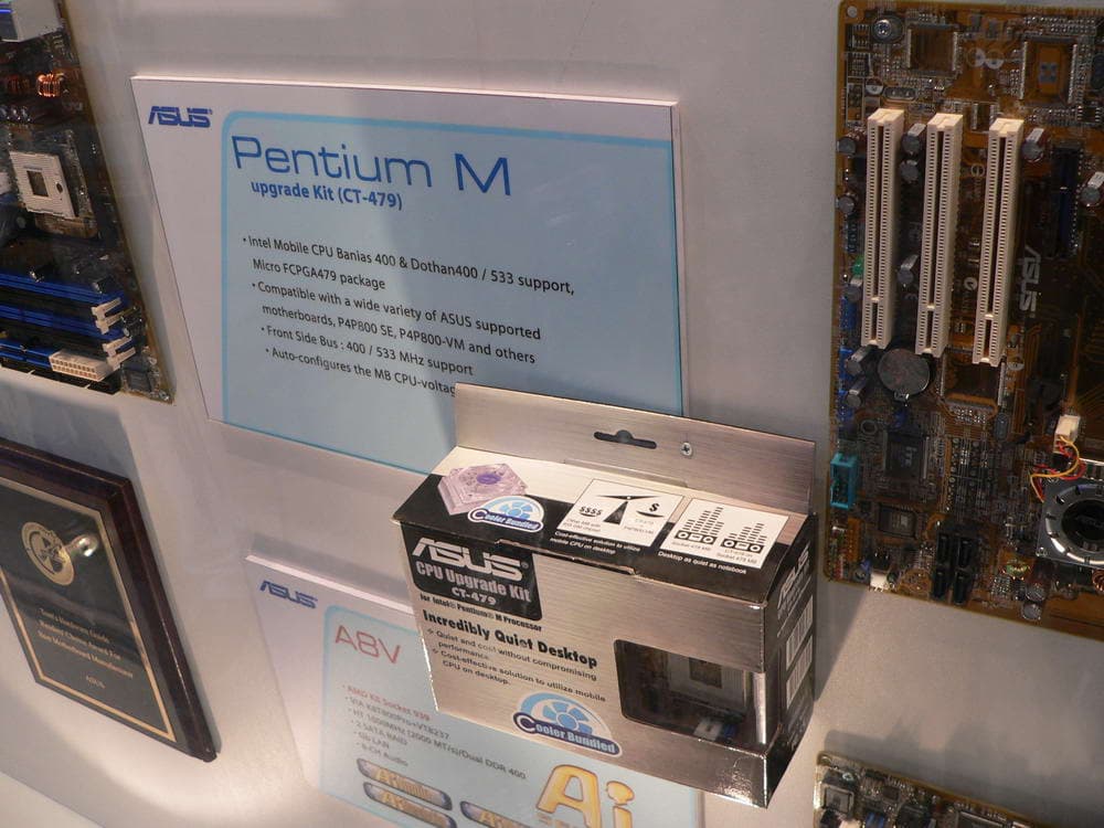 На CeBIT компания ASUSTeK объявила о планах по выпуску на рынок адаптера CT-479, позволяющего устанавливать мобильные процессоры Pentium M, заточенные под разъем Socket 479, в стандартные материнские платы, предназначенные для «настольных» Pentium4 с разъемом Socket 478. В итоге вырисовывается решение, привлекательное как с точки зрения производительности, так и в отношении цены. Адаптер будет стоить менее $50, материнская плата ASUS P4P800SE — менее $100. В такую «полумобильную» систему на базе набора микросхем i865/i875 можно установить 4 Gb оперативной памяти и любую видеокарту, поддерживающую шину AGP 8x.