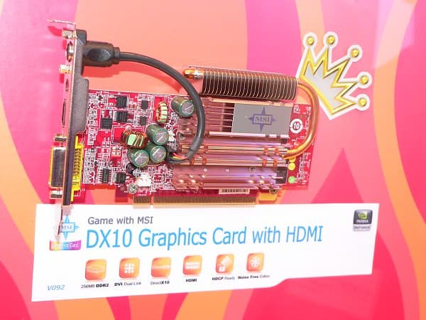 Видеокарта, которую мы ошибочно назвали GeForce 8300 GT, несмотря на свой «усеченный» вид, оказалась 8500-ой. Однако какие-либо характеристики карты выяснить не удалось, остается только любоваться на оригинальное охлаждение от MSI и констатировать, что разъемы HDMI, похоже, становятся неотъемлемым атрибутом недорогих видеокарт, в то время как для дорогих остаются опцией.