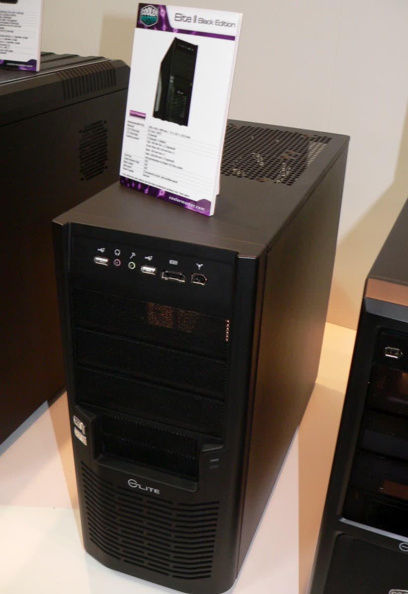 Серия Elite содержит более компактные среднебюджетные корпуса, на которые в настоящее время распространяются и некоторые особенности, ранее характерные для моделей подороже. Например, корпус с характерным названием Black Edition имеет не только соответствующий цвет снаружи, но и изнутри также окрашен полностью, соответственно, вид через окошко не обнаруживает привычной блестящей изнанки. Еще одно удобство заключается в наличии окошка в шасси, через которое можно подобраться к крепежной планки процессорного кулера с обратной стороны платы, не вынимая саму плату, а сняв лишь правую крышку корпуса и отвинтив лючок.