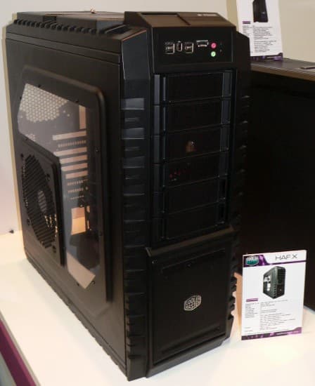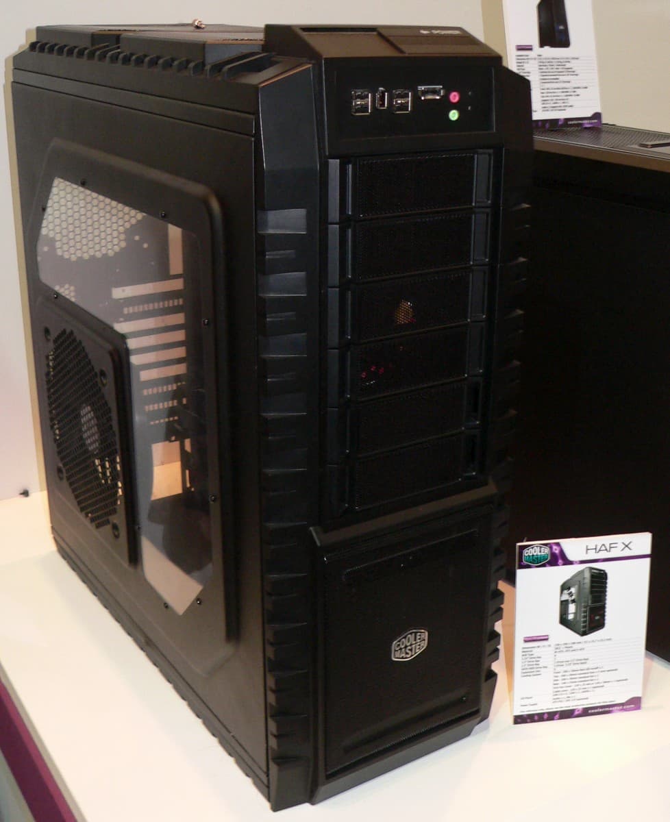 Компания Cooler Master для своей заглавной модели в линейке под названием HAF X выбрала на этот раз подчеркнуто угловатые формы, которые должны намекать на военную технику и, вероятно, в большей степени наземного применения. Геймерам такие мотивы должны прийтись по вкусу. Оснащение, как и следует для моделей такого класса, исчерпывающее: три 200-миллиметровых вентилятора на верхней, передней и боковой стенках и один диаметром 140 мм — на задней стенке. Этого должно хватить для надежного охлаждения конфигурации, собранной на плате формата вплоть до расширенного ATX, 6 накопителей в 5-дюймовых отсеках и 5 — в 3,5-дюймовых. Дополнительно надо упомянуть, закрывающуюся шторкой, кнопку питания.