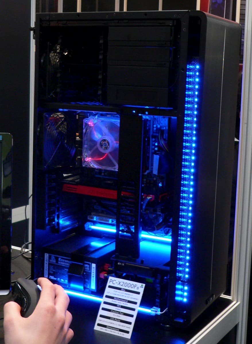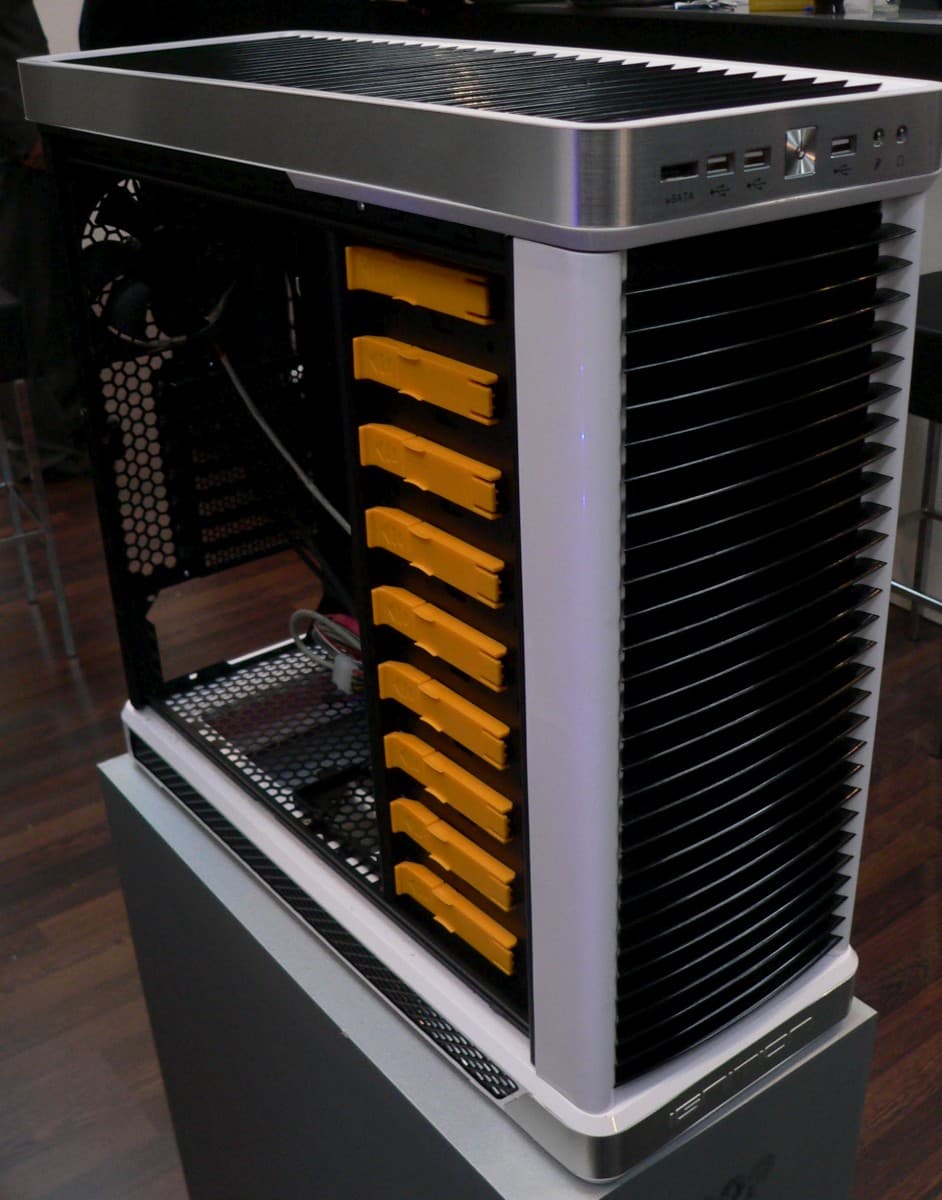 Что касается линейки своих классических полноразмерных корпусов, то в данном вопросе Lian Li консервативно оттачивает старое. Например, в случае с известной 2000-моделью можно отметить лишь переехавший вниз блок питания. А еще одна новация касается почти всех новых моделей от этого производителя: поддержка USB 3.0. Казалось бы совсем нетрудно заменить кабели, которыми порты соединяются с передней панелью, однако совместимостью с этим стандартом именно в контексте корпусов в массовом порядке смогла похвастать на выставке только эта компания.