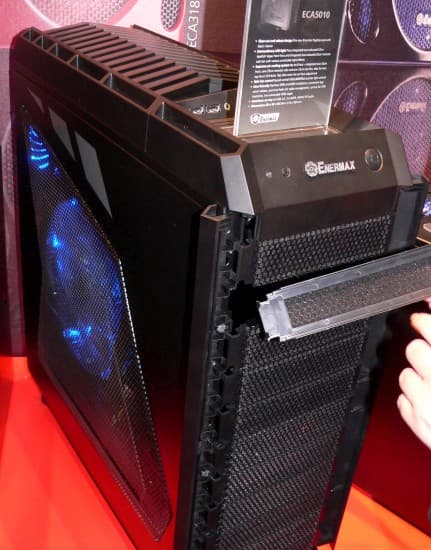 На стенде компании Enermax внимание привлек корпус под названием ECA5010. И не столько огромных размеров вентиляторами с переключаемым светом подсветки, сколько системной заботой о чистоте внутреннего пространства и установленных в нем компонентов. В частности, пылесборники за вентиляционными решетками, хотя и встречаются, но далеко не повсеместно. А пыль ведь имеет свойство не только протягиваться вентиляторами, но и оседать сквозь горизонтальные вентиляционные решетки в верхней панели. В данном корпусе, для тех, кто не захочет ставить вентиляторы в верхнюю панель, предусмотрена остроумная сдвижная конструкция в виде забрала, которое позволяет перекрыть лишние вентиляционные щели.