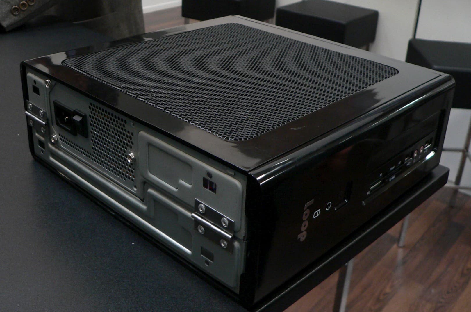 А этот вариант корпуса, также очень компактный, но удобство доступа к microATX-плате здесь обеспечивается за счет того, что блок питания размещен внизу передней панели (на фото корпус обращен к нам передней стенкой, облицовка снята), соответственно из накопителей в копусе поместится лишь полноразмерный оптический привод и винчестер. Немаловажный штрих: блок питания в данном случае подойдет любой стандартный, а чтобы разъем питания находился на привычном месте задней стенки, там размещена обычная колодка, которая соединяется с самим блоком питания внутри корпуса дополнительным кабелем. И ничего кроме вентиляционной решетки в передней стенке, о наличии за ним блока питания не напоминает. Впрочем, и решетка тоже не напоминает, поскольку имеется во всех корпусах.
