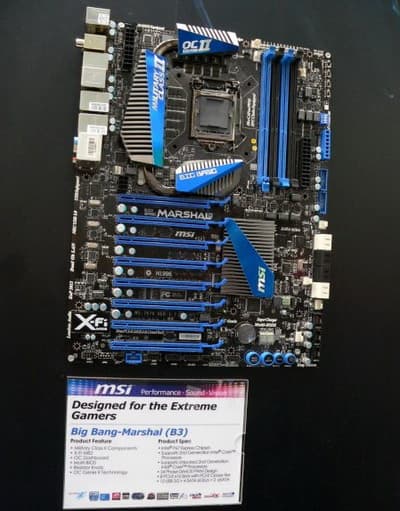 Топовая плата на чипсете P67 с уже ставшей привычной поддержкой Hydra (чипа с дополнительными линиями PCI Express и возможностью сочетать в одной связке видеокарты от AMD и NVIDIA для целей 3D-рендеринга). Часть портов могут отключаться переключателями на плате в целях диагностики. Обращает на себя внимание интегрированное аудио с логотипом X-Fi, версия EAX 5.0. Ну а что касается системы охлаждения, то только мне она показалась практически копией дизайна ASUS Crosshair IV Formula? На этот вопрос, сотрудник MSI отметил: «А они зато позаимствовали название Military Class для своих компонентов". Что верно, то верно.