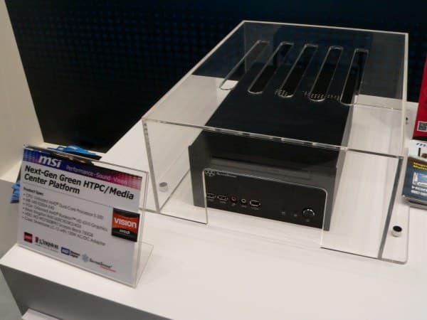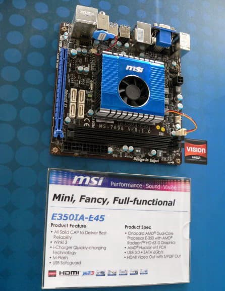 Центральное место экспозиции MSI заняли продукты на основе первого APU от AMD, процессора с интегрированным графическим ядром. Например, весьма неплохо «заряженная» плата в формате Mini-ITX на процессоре E-350. Как утверждает производитель, вентилятор стартует лишь под нагрузкой.