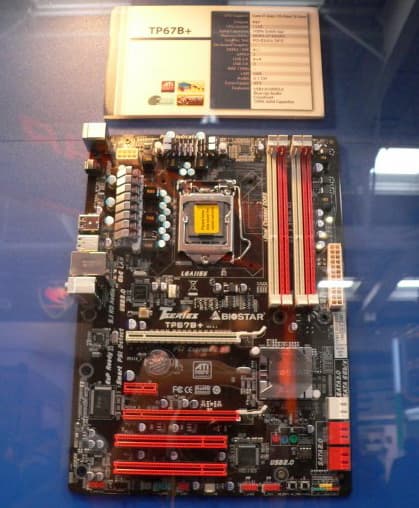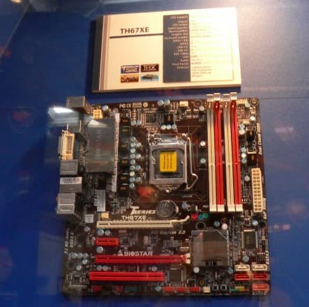 Перемещаемся на стенд Biostar, в отличие от первой пятерки производителей системных плат (включая еще и ECS, и ASRock, о стендах которых подробно рассказывалось в новостях), у этой компании было достаточно скромное представительство на CeBIT. C другой стороны, само наличие стенда и актуальных продуктов, свидетельствует о том, что эта компания (в отличие от десятка других, чьи имена остались в истории), продолжает разивать свой бизнес. И это радует, даже не ради пресловутой конкуренции, а просто, чтобы иметь выбор среди похожих (но все равно не одинаковых) моделей. К примеру, на фото - неплохо оснащенная плата в формате microATX на чипсете H67 с двумя портами USB 3.0 и SATA 3.0, наличием DisplayPort и поддержкой двух графических портов.