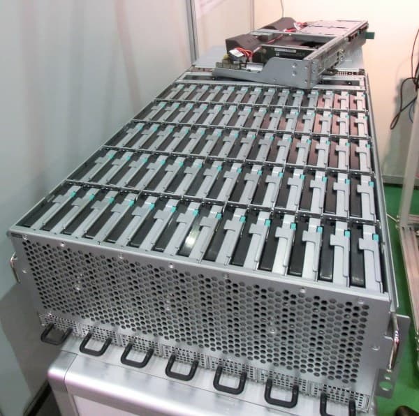 Хотите еще красивых корпусов? А пойдемте-ка на стенд компании ETegro, все же не так много (а вернее - вообще всего несколько) российских компаний имели стенды на этом CeBIT. Тем более, что на фотографии представленна действительно оригинальная разработка. Четырехюнитовый сервер для хранения данных RS430 G4 позволяет разместить 70 дисков формата 3,5″. При этом устанавливаются две материнские платы, каждая из которых имеет доступ к выделенным 35 дискам формата 3,5″ и двум дискам формата 2,5″, также поддерживающим горячую замену.