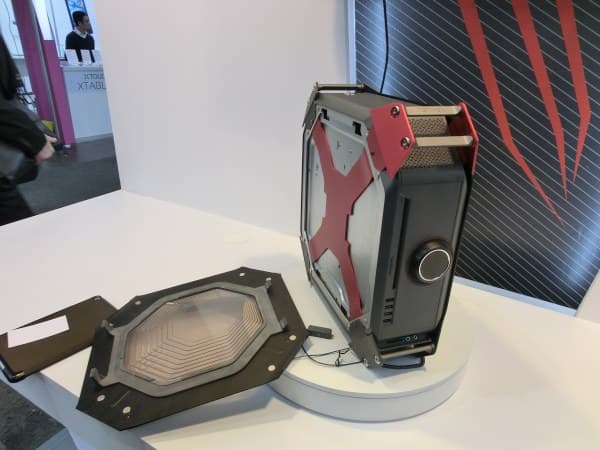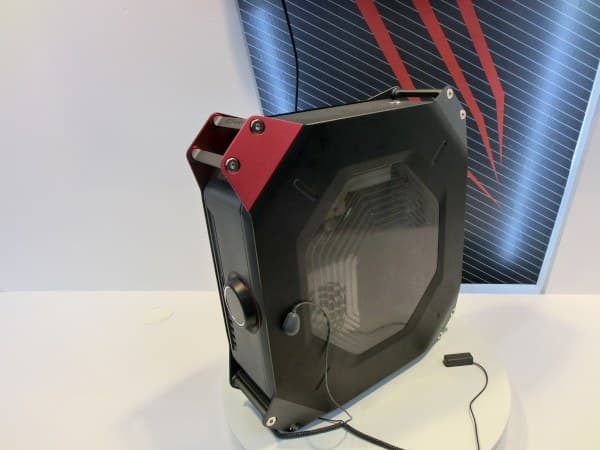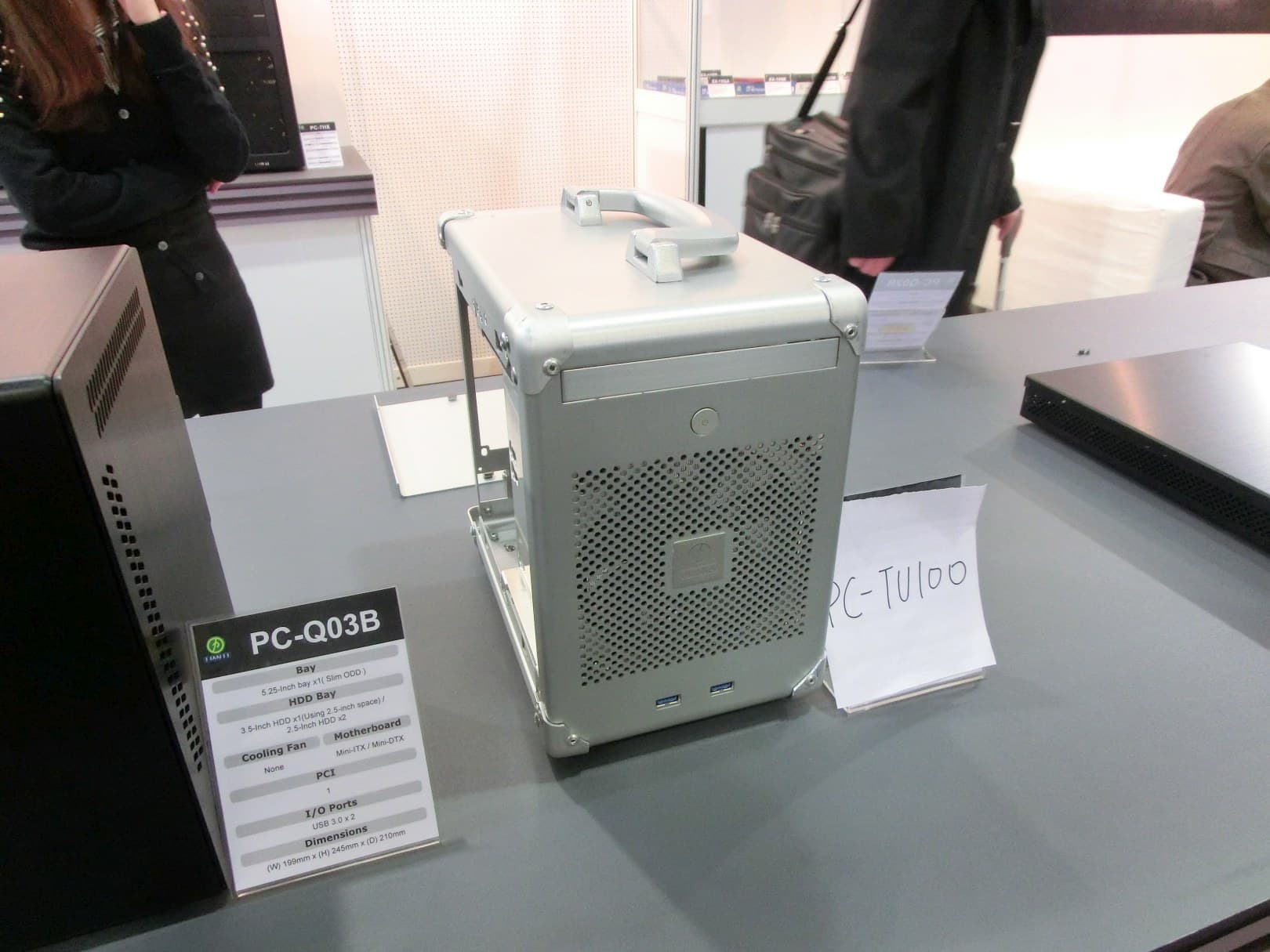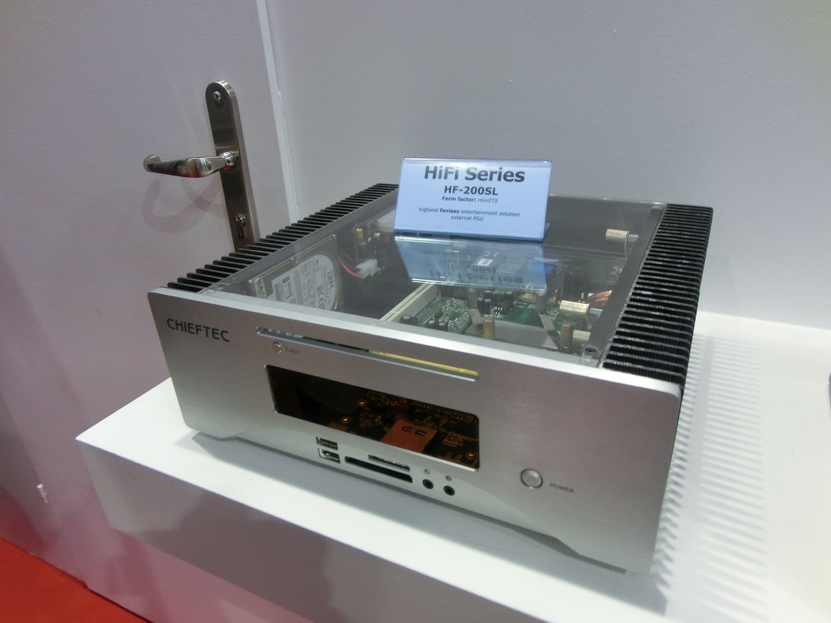 Вот такой любопытный экспонат, в формате так же допускающем лишь установку Mini-ITX-платы, представила на своем стенде компания Chieftec. Корпус достаточно крупный, дизайн нельзя назвать универсально-симпатичным (на любителя). Зато начинка вполне сможет обходиться без вентиляторов, тепло отводится на ребристые стенки. Фанатам тишины понравится.