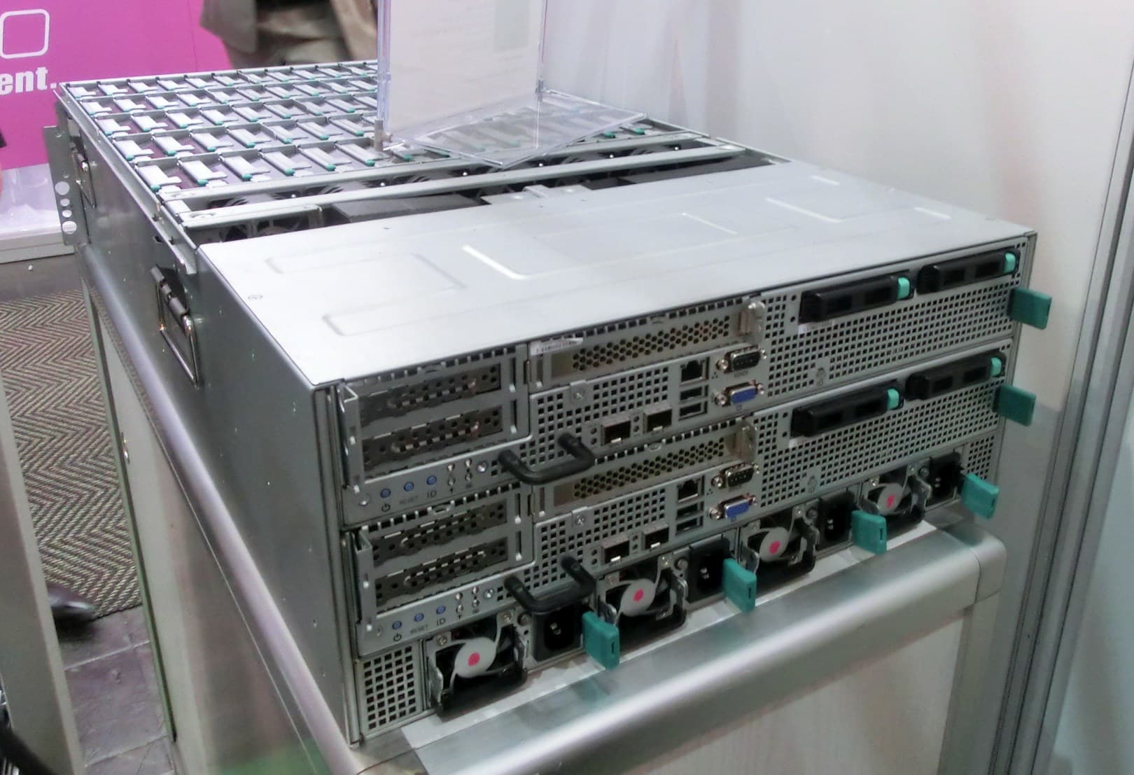 Каждая материнская плата поддерживает 512 ГБ оперативной памяти DDR3-1600 в 4-канальном режиме. Устанавливаются процессоры Intel Xeon серии E5-2600. Сервер оснащен интегрированным двухпортовым адаптером 10GbE с разъемами формата SFP+, питание обеспечивают высокоэффективные блоки питания, сертифицированные по стандарту 80+ Platinum.