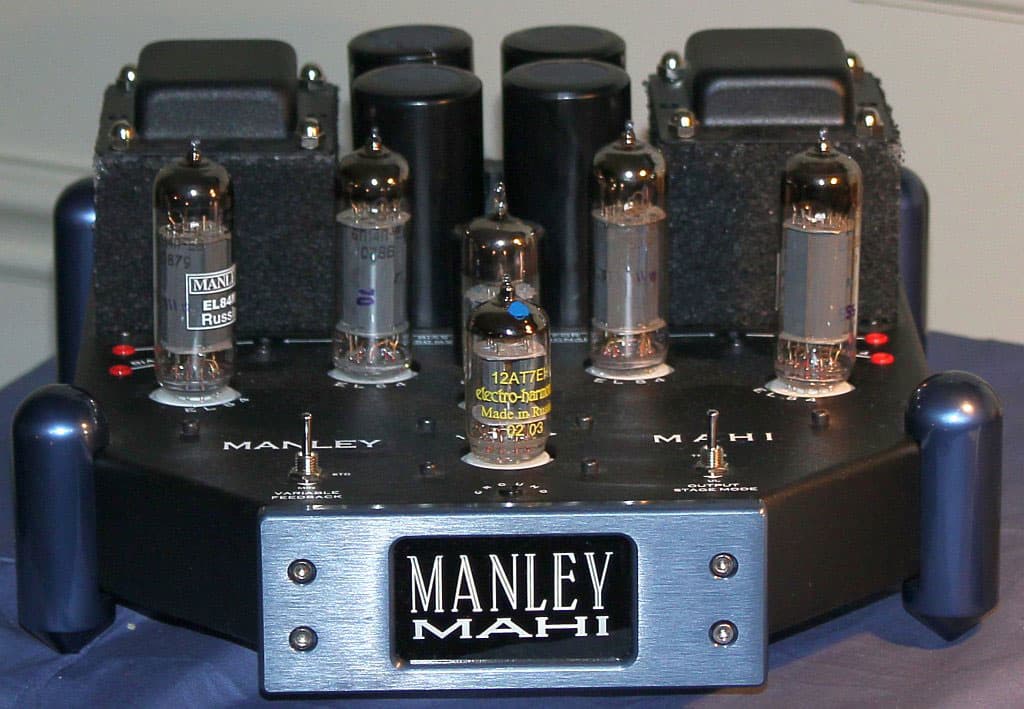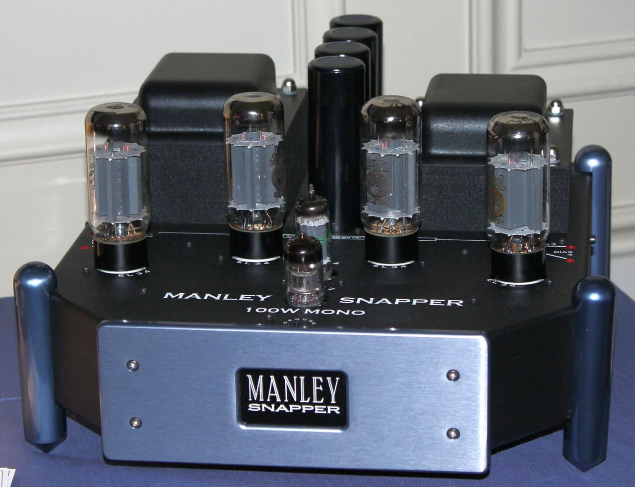 Ладно, поднялись, заходим в первую комнату. Занятно: ламповые усилители Manley Laboratories, Inc. Вы знаете о такой? Я — нет. Показывают вот такие конструкции: