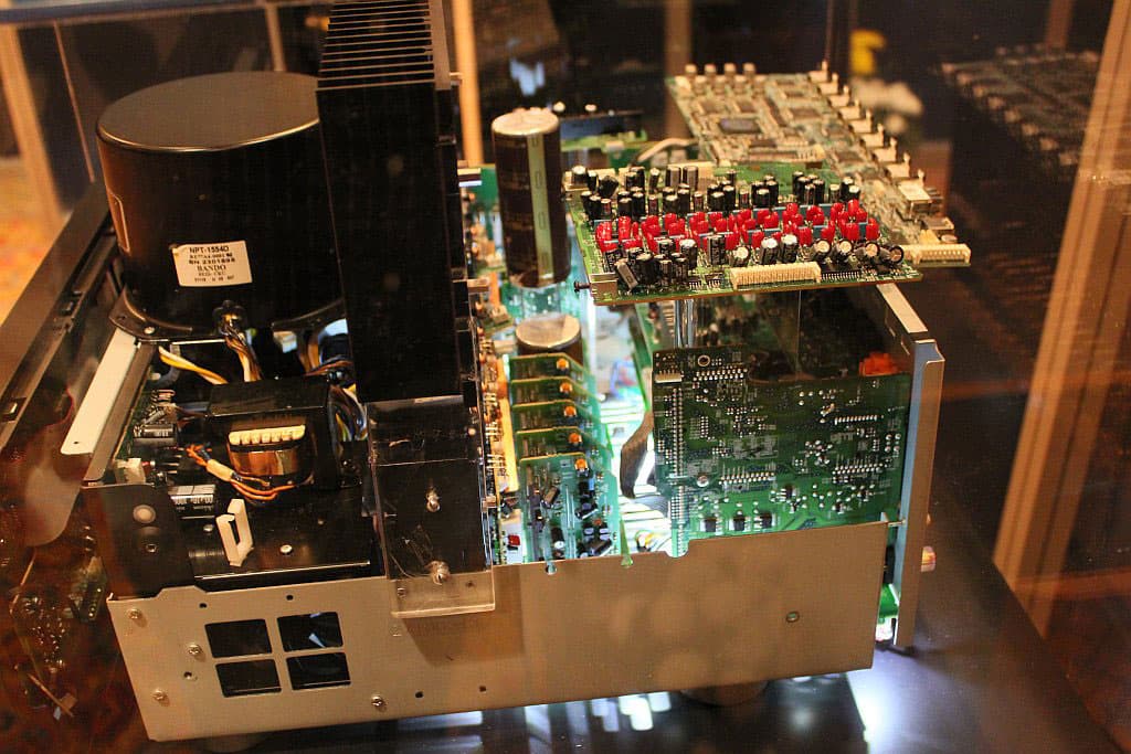 С удивлением обнаружил, что в списке производителей аудиооборудования для домашних театров не так много названий из тех, что на слуху: Onkyo, NAD, Sherwood и… всё. Причём последний — в углу основного раздела выставки, а не в аудио. Но об этом потом. Ну что же, как я писал в прошлом году — у меня есть несколько вопросов к Onkyo… Фотографировать особо было нечего, кроме разобранного Onkyo TX-SR 1007.