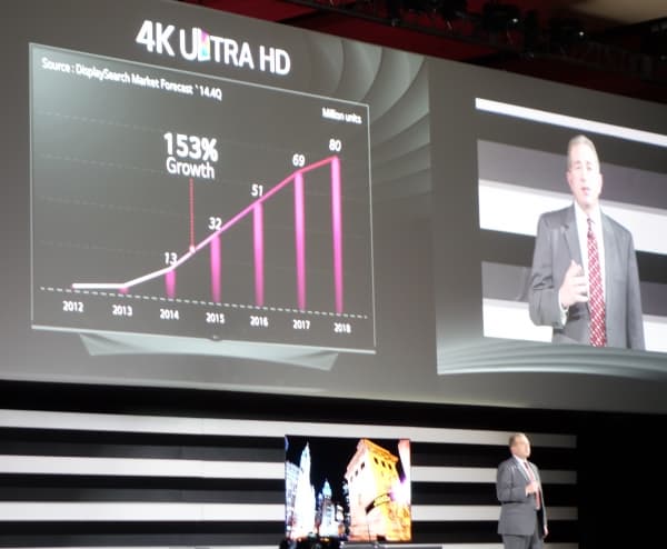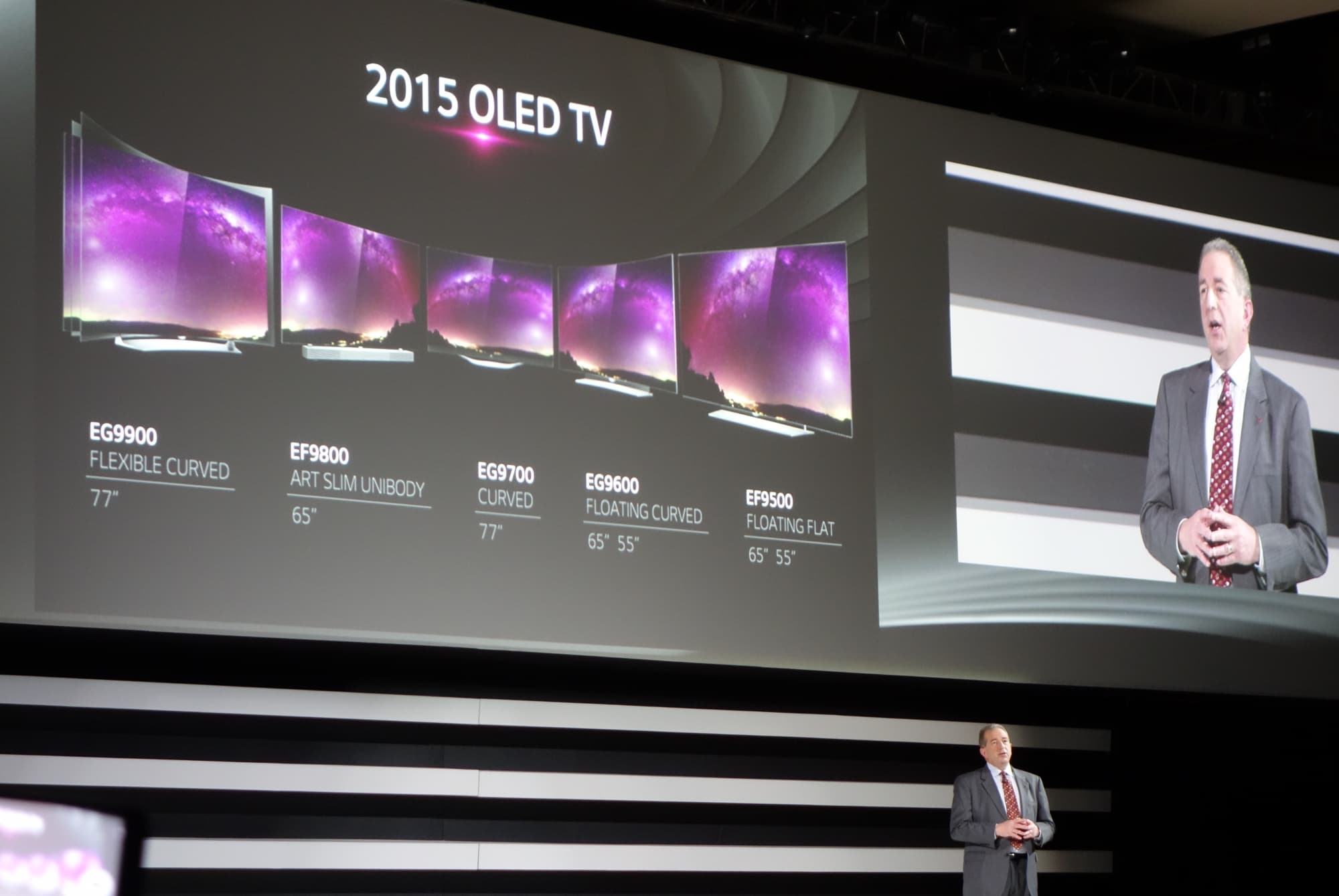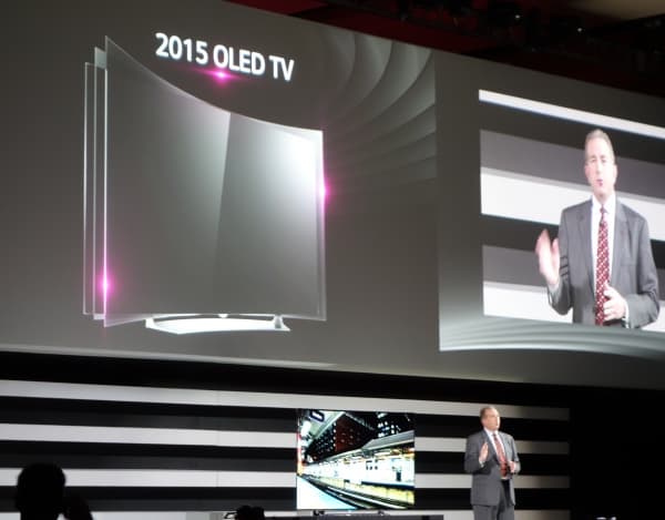 Как и большинство мероприятий подобного рода, утренняя презентация LG была призвана обозначить основной круг новых продуктов, которые были привезены компанией для демонстрации на выставке. Называется такой формат по-английски «keynote», и рассказать о своих ключевых продуктах за день до начала выставки выказали желание практически все участники. Прежде всего, LG представила в этот день новую серию телевизоров формата 4К, расширяющую успешно дебютировавшую в 2014 году линейку OLED-телевизоров высокого разрешения. Серия пополнилась семью различными новыми гибкими (Flexible Curved), изогнутыми (Curved) и плоскими (Flat) моделями с экранами с диагональю 55, 65 и 77 дюймов.