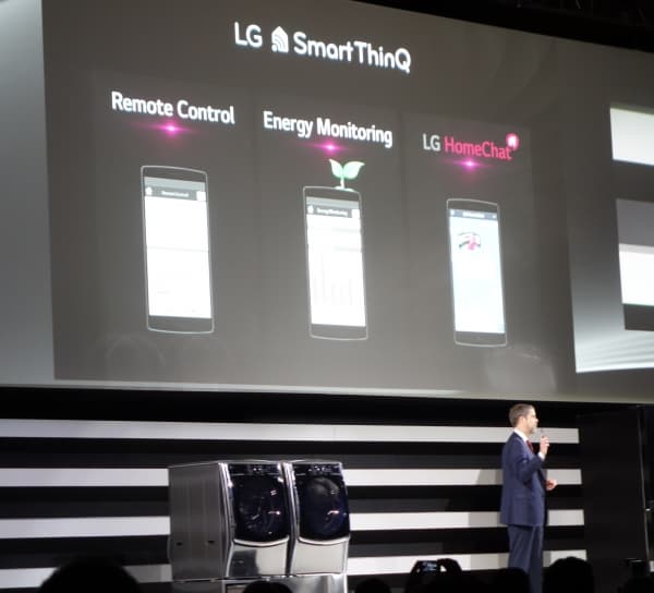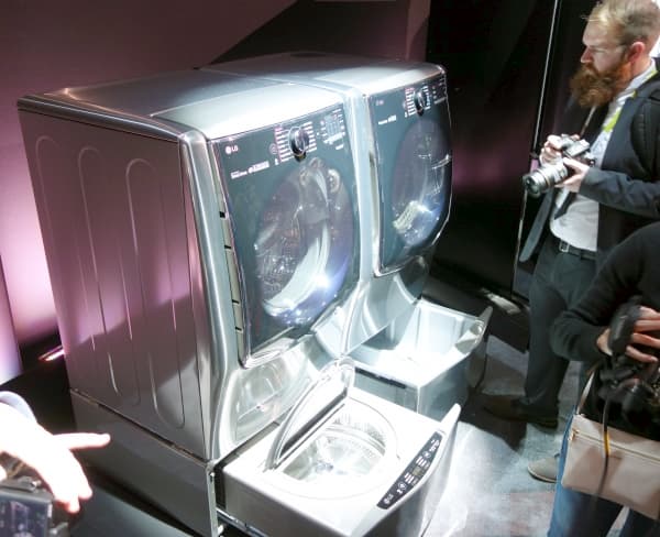 Помимо телевизоров LG продемонстрировала свой новый взгляд на домашнюю стирку, представив совершенно новую категорию стиральных машин с двумя отделениями. Система Twin Wash позволяет загружать вторую порцию белья и стирать в двух разных отделениях одновременно, что сокращает время общей стирки и продлевает жизнь стиральной машине, уменьшая количество циклов.