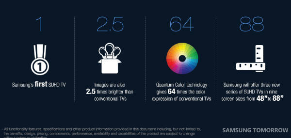 Серия новейших телевизоров с придуманным Samsung для них необычным названием «SUHD» (где «S» символизирует сразу несколько слов, от smart (умный) до spectacular (зрелищный)), включает целый ряд моделей с девятью различными размерами диагонали экранов от 48 до 88 дюймов. По заверениям разработчиков, экраны SUHD-телевизоров в 2,5 раза ярче и способны передавать в 64 раза больше цветов, чем существующие модели.