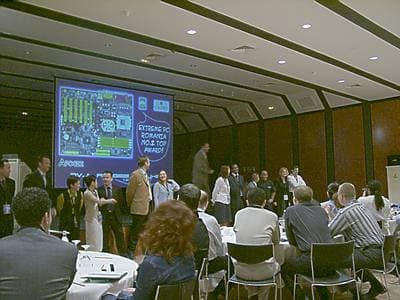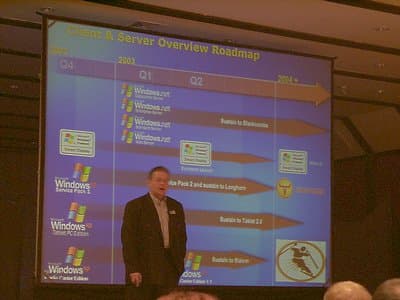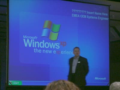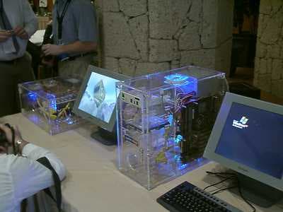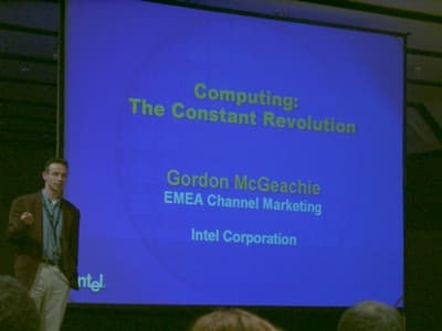 Выступление Гордона Макгичи (Gordon McGeachie) из Intel носило общий характер и было посвящено эволюции современных PC. Начав отсчет с 1985 года, он как дважды два доказал, что венцом эволюции является процессор Pentium 4 c технологией Hyper-Threading. :)