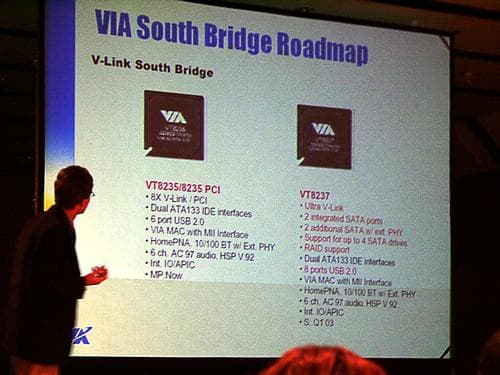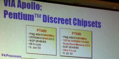 На этом Гирт завершил свое выступление, и дальше, с небольшими перерывами, последовали доклады всех прочих организаторов этого мероприятия. Представитель VIA Technologies Михал Лизецки (Michal Lisiecki) рассказал о ближайших планах своей компании. Ничего неожиданного мы не услышали, но некоторым нашим читателям, которые не слишком пристально следят за новостями, возможно, будет интересна информация по дискретным чипсетам VIA под Pentium 4 (из ожидаемых новинок в области интегрированных — лишь PM400T = PT400 + CastleRock-II). PT400 — перемаркированный P4X400 с как бы официальной поддержкой DDR400 и процессорной шины 800 МГц, а PT600 добавит к этому двухканальный доступ к памяти, включая ту же DDR400, и ускоренную связь между мостами чипсета.