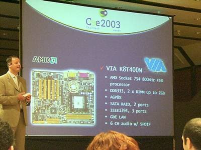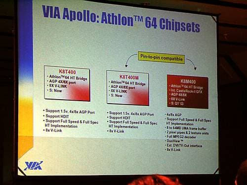 Также упомянем про давно ждущие отмашки к началу производства чипсеты под Athlon 64: K8T400 — с поддержкой AGP 8x, и K8M400 — c поддержкой внешних видеокарт через AGP 8x и интегрированным ядром CastleRock-II. (K8T400M — модифицированный вариант K8T400, с не изменившейся функциональностью, но совместимый по разводке с K8M400.)