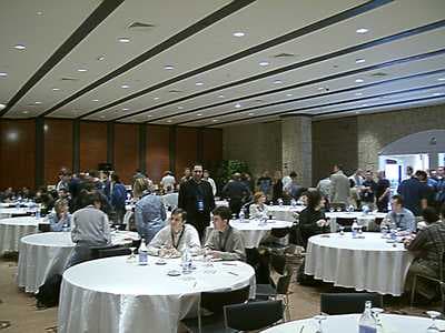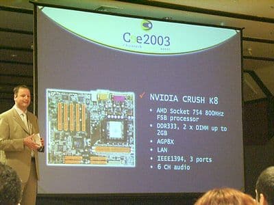 После очередного перерыва последовала презентация NVIDIA. При всем желании не смог бы утверждать, что небольшое шоу, показанное в рамках демонстрации возможностей GeForce FX, оставило зал равнодушным, но все же пересказывать его не стану, так как и информация о подобной презентации в Москве, и детальнейшее исследование нового видеоускорителя уже приведены на сайте и выполнены куда более компетентными в этом вопросе спецами нашей «Видеосистемы». То же самое относится и к представлению nForce2, так как наши читатели уже могли подробно познакомиться с этим чипсетом в статьях сайта.
