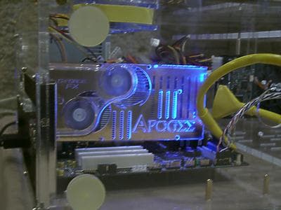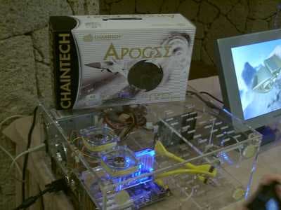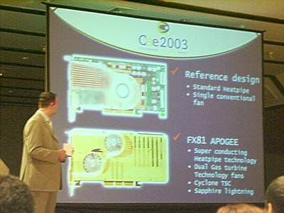 У входа же, в специально затемненном уголке, демонстрировалась в работе главная гордость Chaintech и первый номер всей презентации — модель видеокарты Apogee FX81 на чипе GeForce FX от NVIDIA.