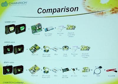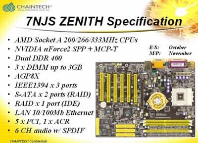 Стержнем всей презентации Chaintech был анонс вывода компанией на рынок новых high-end системных плат семейства Zenith. Поскольку в это семейство входят решения на семействе чипсетов nForce2 под процессоры семейства К7, выступление Chaintech было гармонично завязано с презентациями NVIDIA и AMD.