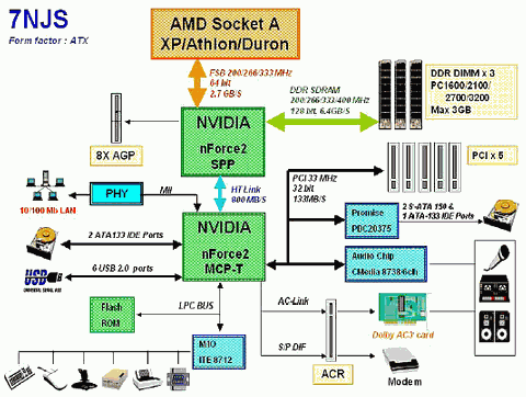 Итак, серия Zenith и новая плата этой серии под процессоры AMD Athlon XP — 7NJS. Репортаж о появлении этой платы в нашей лаборатории с подробнейшими фото был опубликован мной в новости от 11 октября (см. Фото дня: системная плата Zenith 7NJS от Chaintech на чипсете nForce2), переадресовываю туда всех желающих полюбоваться деталями, статья, посвященная тестированию этой и других плат на чипсете NVIDIA nForce2, также готова: NVIDIA nForce2: мощный старт с шестью платами от известнейших производителей. Здесь же, ради экономии вашего трафика, приведу лишь фото платы, общий вид комплекта да блок-схему: