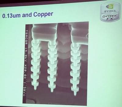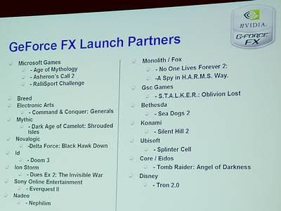 Прежде всего, приятно поразил слайд, на котором два знаменательных названия — GeForce и 3dfx, сливаются в одно новое — GeForceFX. По словам Алана, в создание нового чипа немалый вклад внесла сотня перешедших полтора года назад из разорившейся 3dfx инженеров и программистов. GeForceFX — первая реальная работа этой команды в NVIDIA.