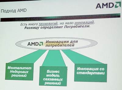 Словом, бизнес-модель работы AMD строится на открытых стандартах, совместимости и ориентации на конечного пользователя. Говоря человечьим языком, компания намерена заботиться о поддержке своих решений индустрией (прекрасный пример тому — шина Hyper Transport), поддерживать эволюционную, а не революционную политику выпуска своих новинок (в числе прочего, намек на обратную совместимость), при этом всегда помнить о том, что какой бы модной и навороченной не была новинка, гораздо охотнее ее купят по разумной цене. И еще одна озвученная мысль: компания даже не собирается пытаться все делать в одиночку, разработка и внедрение новинок в сотрудничестве с партнерами — твердая позиция AMD.