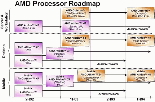 Про AMD писать всегда трудно, особенно, новости, поскольку утечки данных из компании — дело редкое, слухи, разносимые для вящего задора журналистами, в большинстве своем оказываются выдумками. Словом, информация дозируется своевременно, и жесткой рукой. Впрочем, в такой политике есть свои определенные плюсы: согласитесь, никто сейчас не знает, как долго будут еще востребованы рынком те же процесоры Athlon XP — год, два? Многие компании, разгоряченные невиданным подъемом активности полупроводникового рынка три-четыре года назад, уже обожглись на неосторожных прогнозах на предстоящие пятилетку — две. Вот и AMD, показывая свой текущий роадмэп лишь до первого полугодия 2004 года, в большинстве случаев заявляет: «все зависит от востребованности рынка».