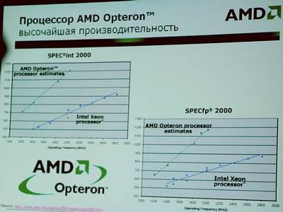 С серверными процессорами Opteron дела обстоят и проще, и, на мой взгляд, сложнее. С одной стороны, продемонстрированные результаты тестирования вызывают уважение, нам было предложено обратить особое внимание на ожидаемые в перспективе темпы прироста производительности процессоров Opteron. Что ж, впечатляет, однако никто не скрывает, что выход на серверный рынок, завоевание там своего места — процесс не такой уж простой, и за это место AMD еще биться и биться. Кстати, на каверзный вопрос, почему это производительность 64-битных процессоров Opteron сравнивается с 32-битными чипами Intel Xeon. г-н Беленький с улыбкой отметил, что продукты семейства Itanium не являются чипами архитектуры x86. Следовательно, они вообще тут не при чем. Еще одно замечание: «Itanium — продукт сегментный».