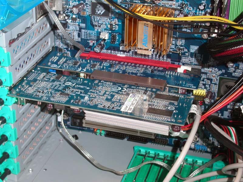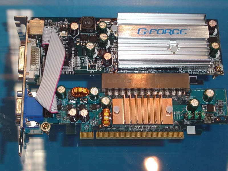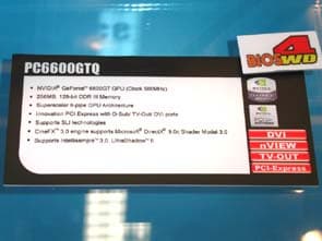Компания представила на своём стенде полную линейку плат от 915 до 955X. Решения, в большинстве своём стандартные, а вот среди видеокарт у Albatron есть интересные разработки. Первое из них — ATOP, переходник с PCI-E на AGP, подходящий для низкопрофильных видеокарт. С виду громозкое решение вполне работоспособно в составе системы. Видеокарта выполнена на чипе GeForce 6200 со стандартными частотами — 350 Мгц — частота чипа, 128 Мбайт, 64 бит DDR.