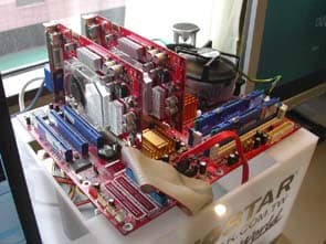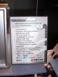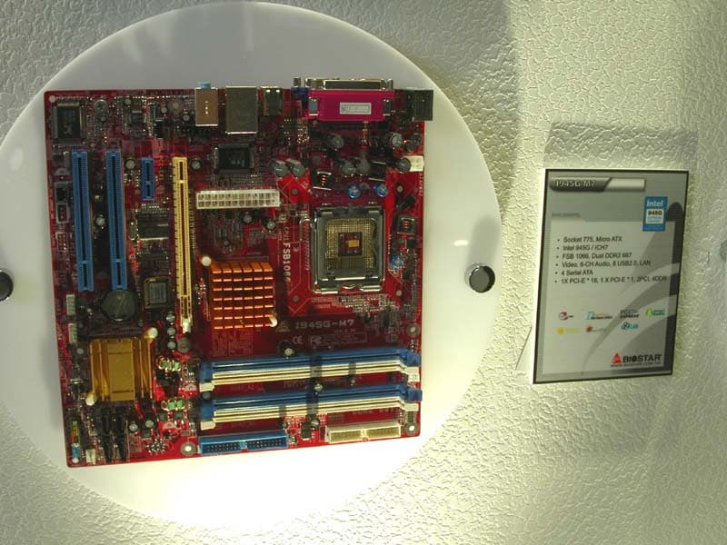 Также на стенде были представлены платы на чипсетах Intel с полной поддержкой двух слотов PCI-E х16. Представитель Biostar сказал, что на текущий момент это реализовано для поддержкимультимониторности, но при этом не стал отрицать, что со временем возможна поддержка и CrossFire или NVIDIA SLI. Вопрос только в лицензированнии со стороны ATI и NVIDIA.