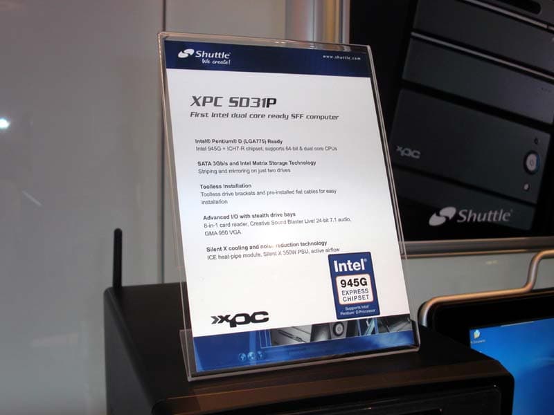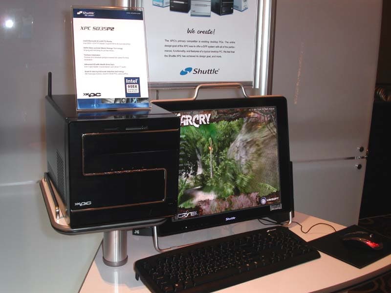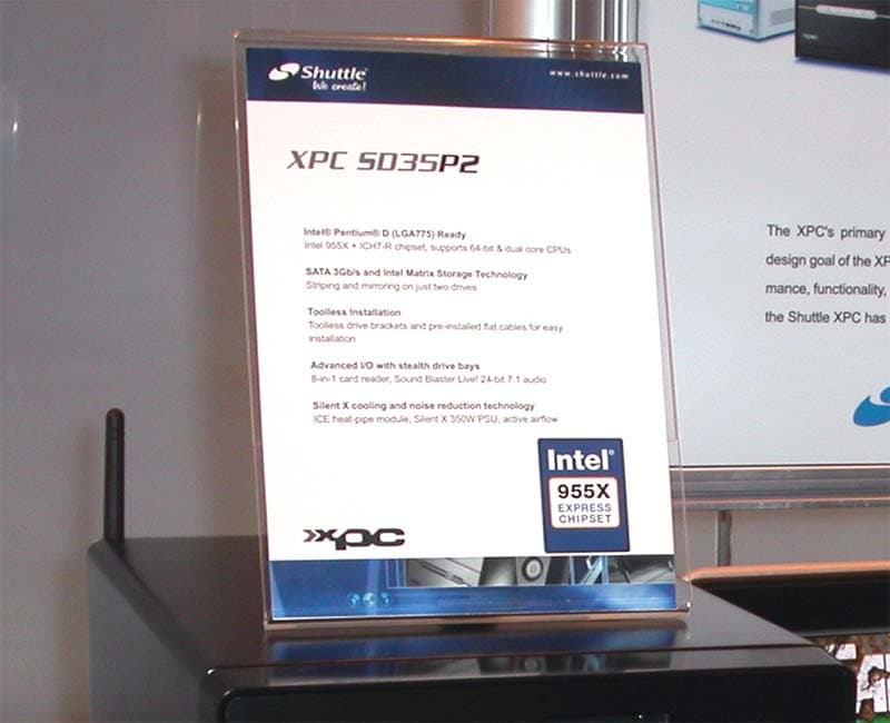 Стенд компании Shuttle был обустроен в здании большого торгового центра «New York, New York». Основное место в экспозиции занимали знаменитые «кубики». Топ-модель XPC 5035P2 для процессоров Intel на чипсете 955Х + ICH7R, в комплекте 8-в-1 кардридер, звуковая подсистема построена на базе Sound Blaster Live! 24-bit 7.1, а напряжение для этой системы поставляет блок питания 350 Вт.