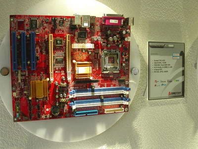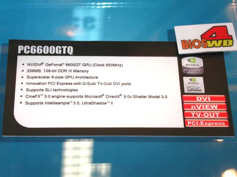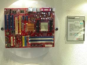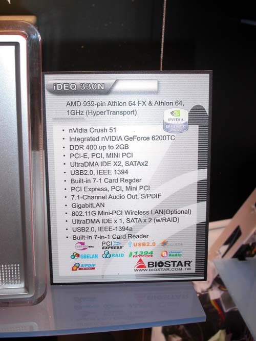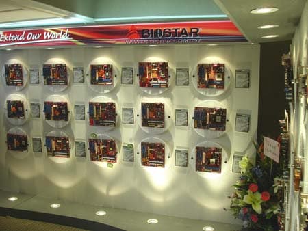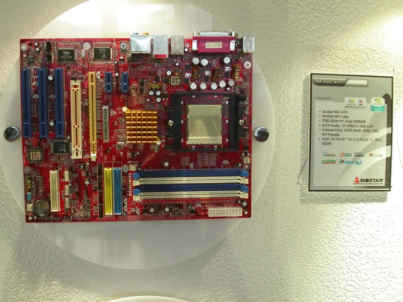На стенде Biostar, расположившегося в одном из номеров в гостиницы Хайят были представлены достаточно интересные решения. Как, например, платы с нативной поддержкой PCI-E х16 и AGP через мост, на чипсетах от NVIDIA на чипсетах nForce 4 Standart и на nForce 4 Ultra.