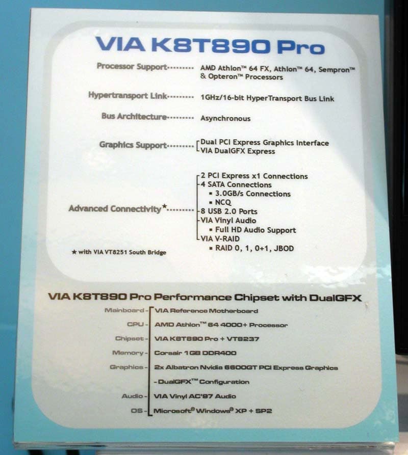 Производитель чипсетов компания VIA представила решения на двух чипсетах, первый из них K8T890 Pro-SLI поддерживает технологию от NVIDIA, хотя пока и не лицензирован последней, но всё работает.